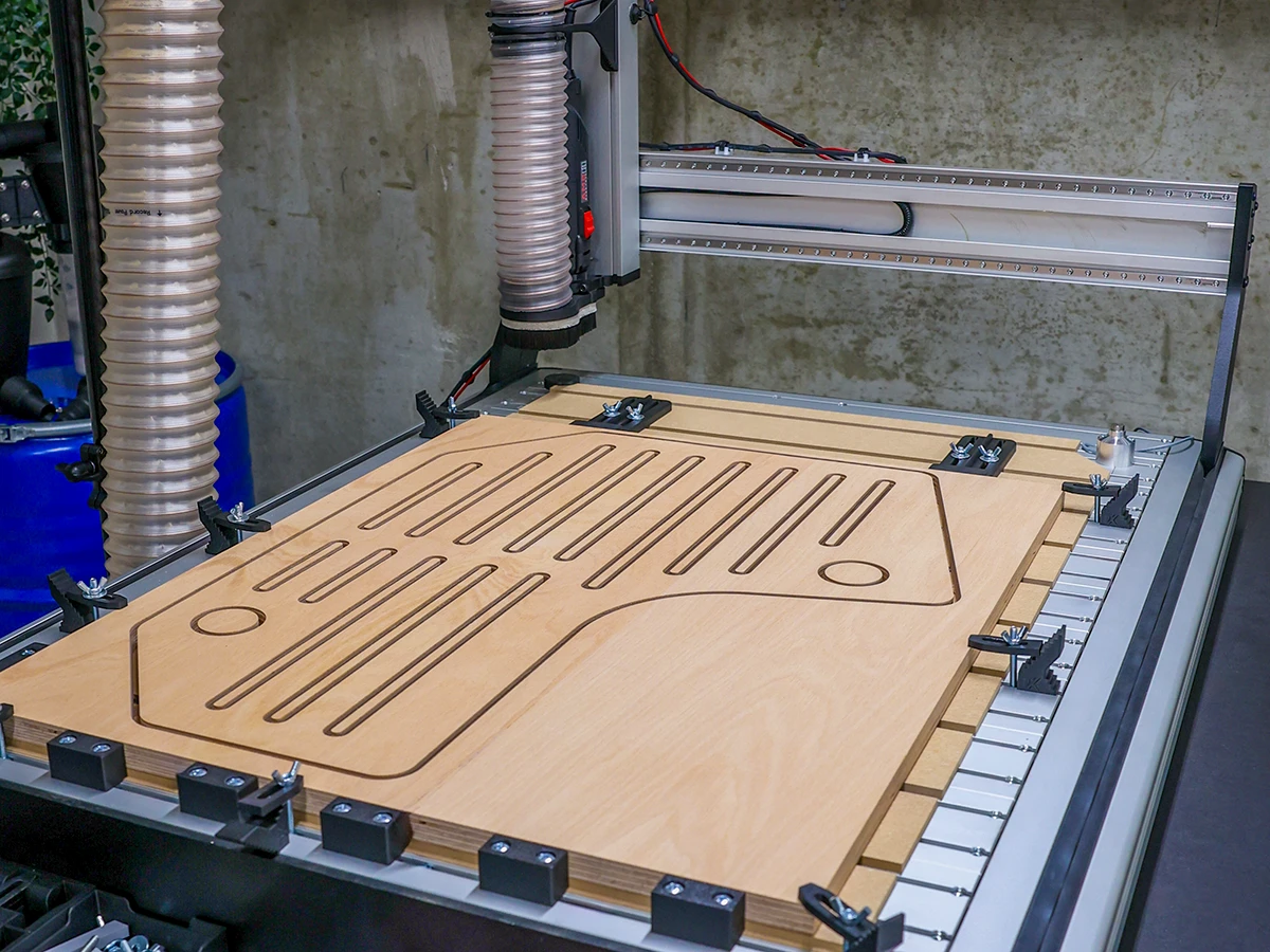 Meine CNC-Fräse ermöglicht einen Arbeitsbereich von 1044 x 679 mm bei Materialstärken von wenigen Millimetern bis hin zu stabilen Werkstücken. Auch kleinere Projekte sind selbstverständlich problemlos möglich. Sollte ein Format einmal nicht ausreichen, können mehrere Platten miteinander verbunden werden.