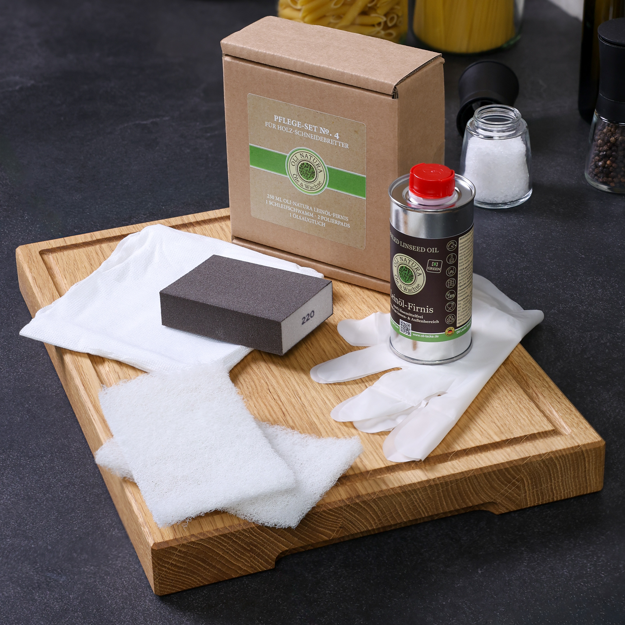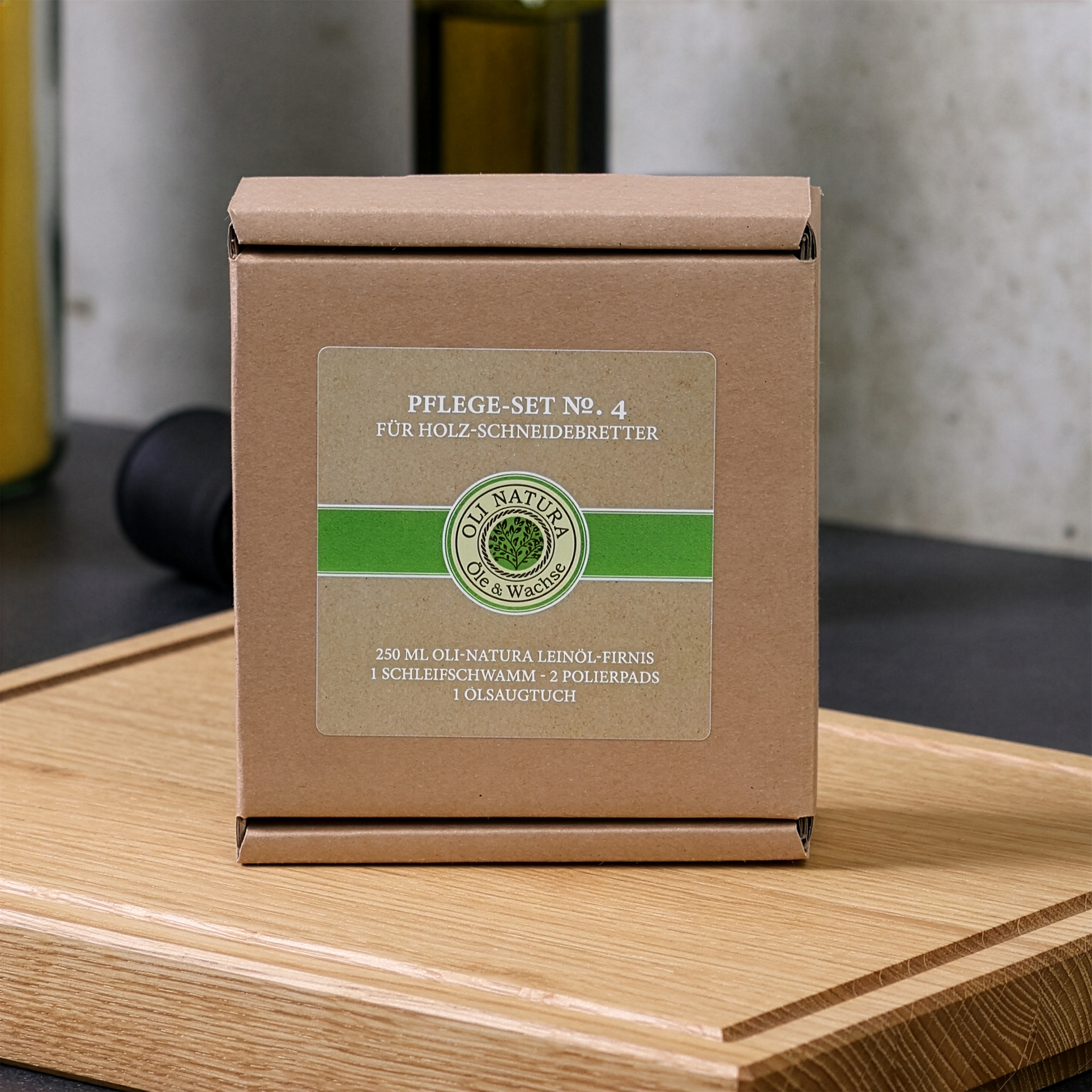 Das Pflege-Set No. 4 von OLI-NATURA mit dem lebensmittelechten & lösemittelfreien Leinöl-Firnis enthält alles, was für die regelmäßige Pflege und Auffrischung geölter Holzoberflächen benötigt wird. Ob Schneidebrett, Brotzeitbrett oder Küchenabdeckung – mit diesem Set bleibt das Holz geschützt, geschmeidig und behält seinen natürlichen Charakter.