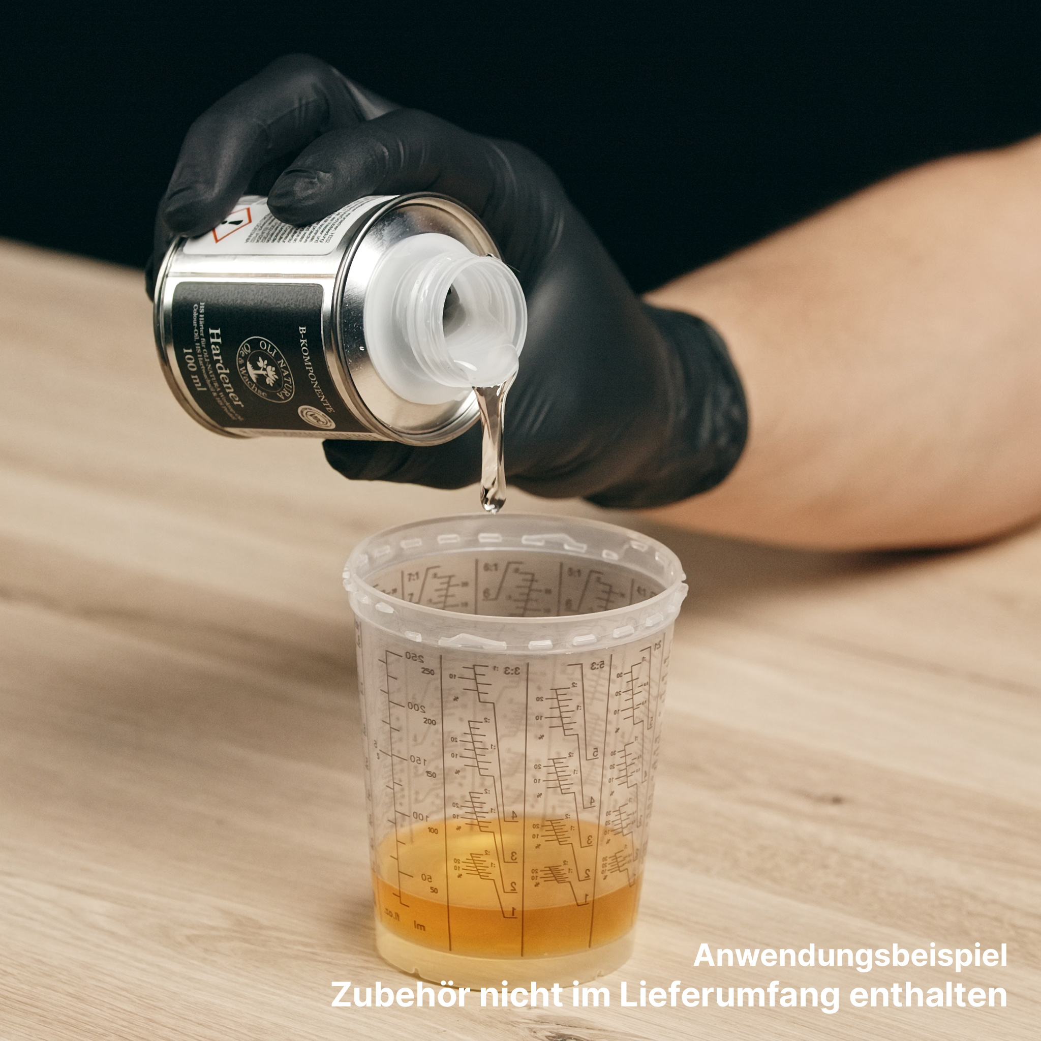 - Härter erst kurz vor Gebrauch mit dem vorgesehenen Öl im angegebenen Mischverhältnis gründlich vermischen.